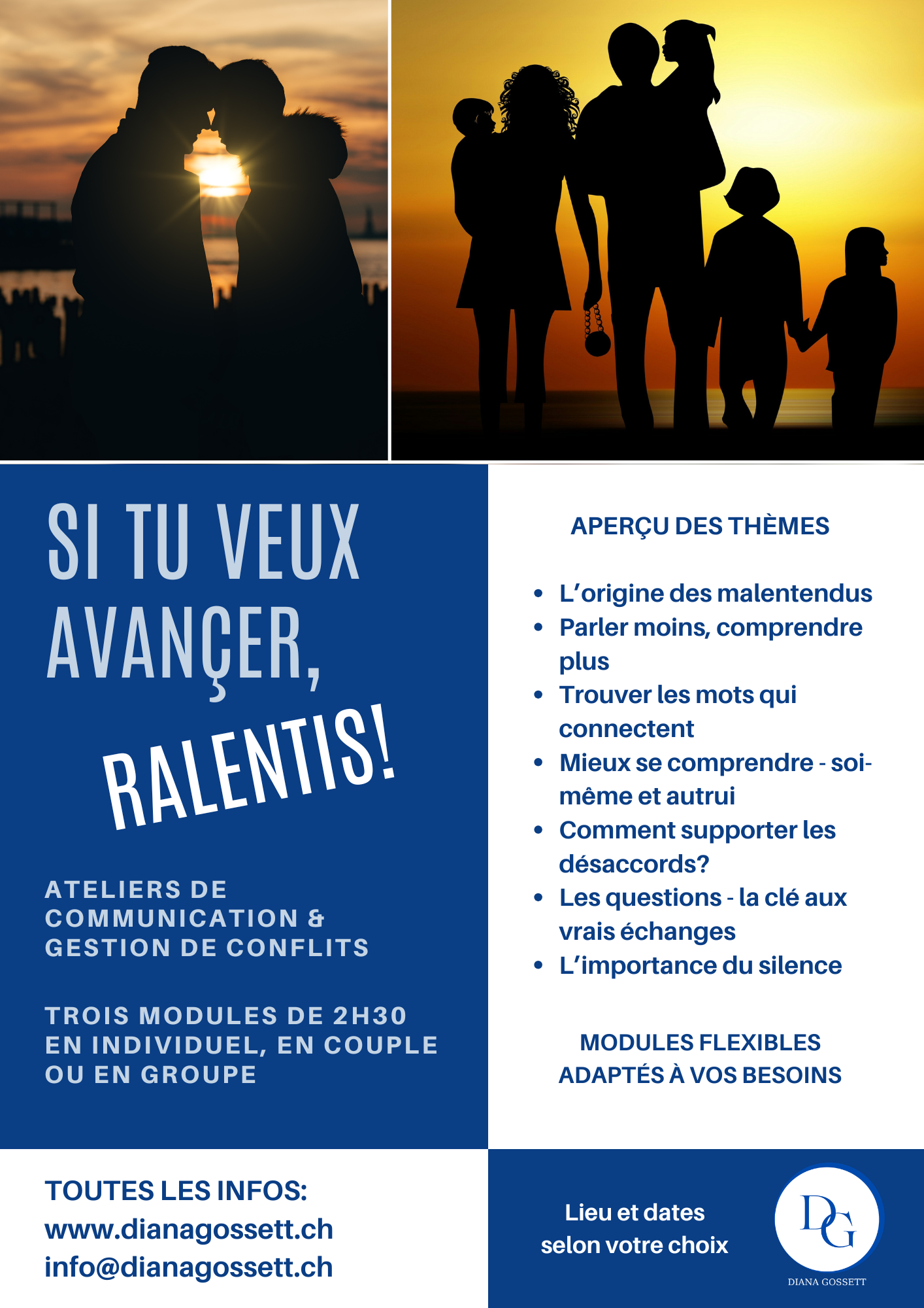 Le suivi de l’atelier en individuel ou en couple permet une approche personnalisée, adaptée à vos besoins et objectifs. Vous bénéficiez d’une écoute active et de conseils et outils sur mesure. L’atelier crée un cadre sécurisé où vous pouvez exprimer vos préoccupations sans jugement. En somme, c’est une opportunité d’améliorer vos compétences en communication et résolution de tensions de manière ciblée et efficace.